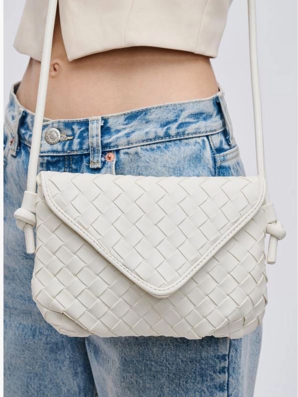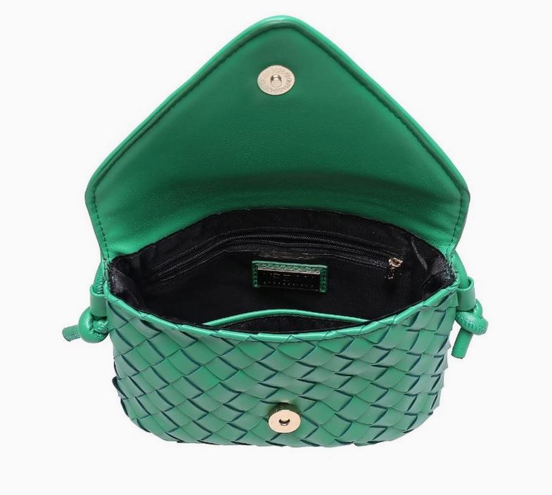Elevate your look with the charm of our Woven Vegan Leather Crossbody. The knotted strap and gold hardware beautifully complement the envelope shape, creating an accessory that's both stylish and functional with its fabric-lined interior, including one zip pocket and one slip pocket.