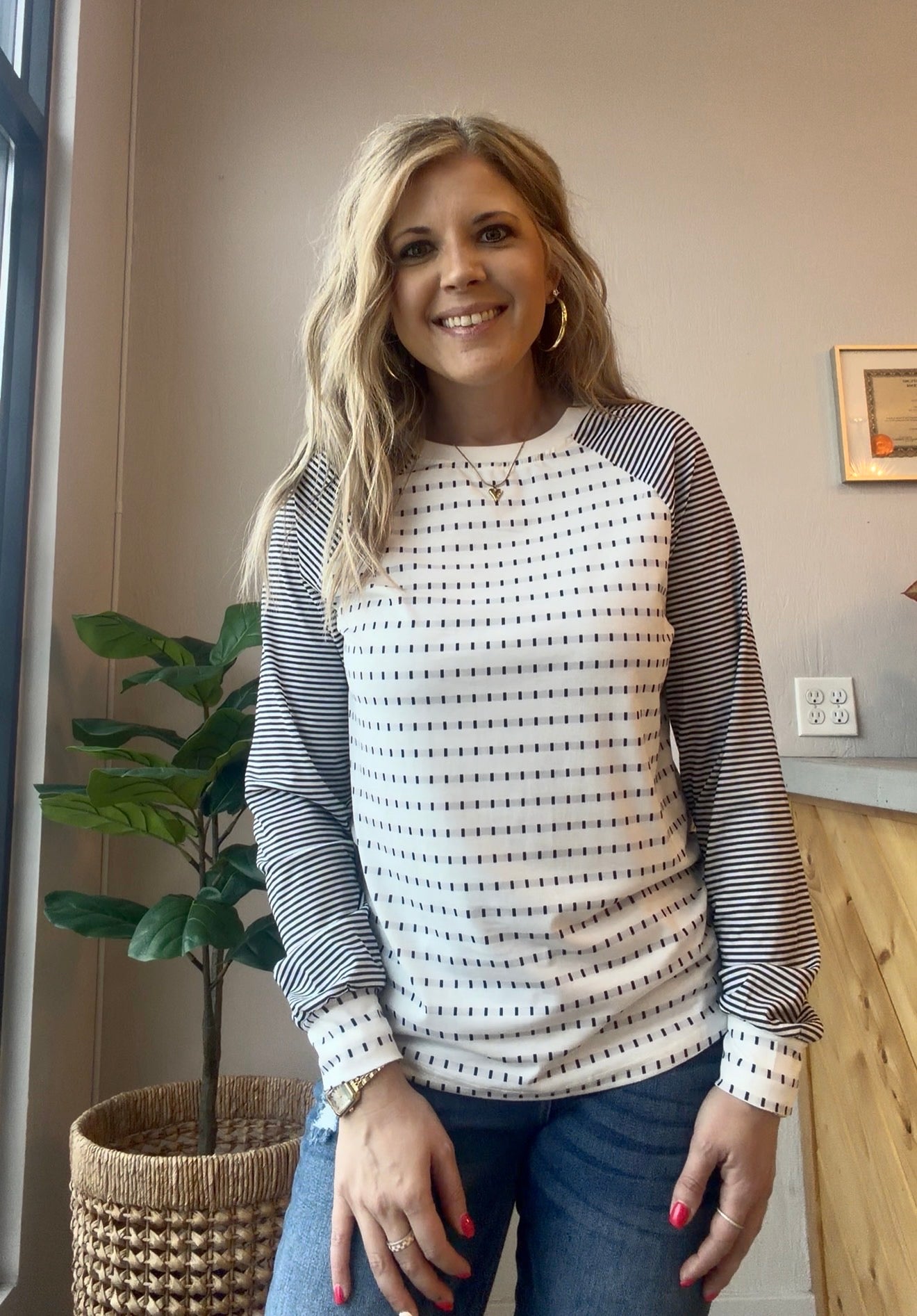 An easy everyday top with subtle contrast striping for a refined look.