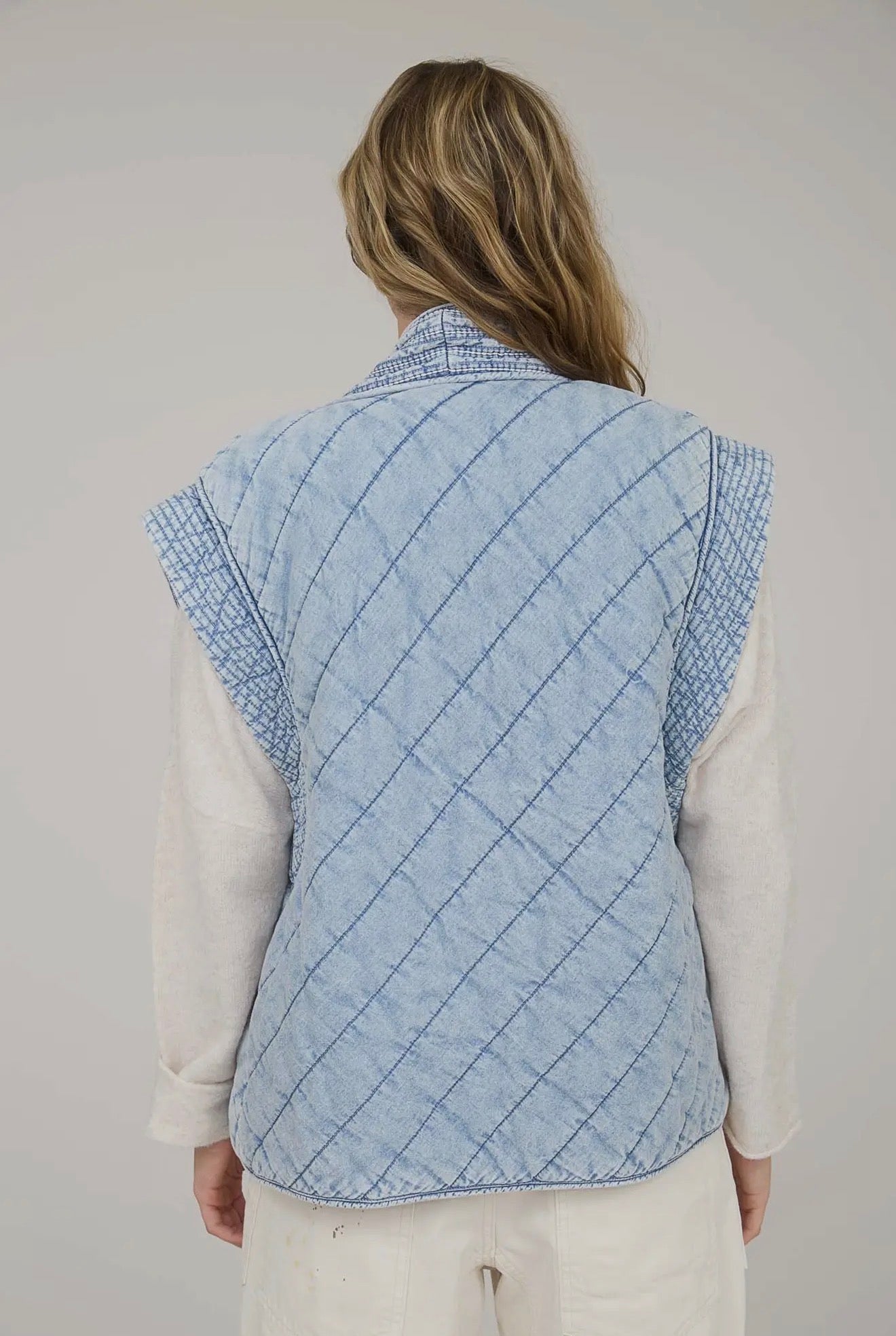 A lightweight, quilted vest in a soft washed blue with beautiful stitched detailing throughout. Designed with an open front, subtle collar and roomy patch pockets for easy layering.