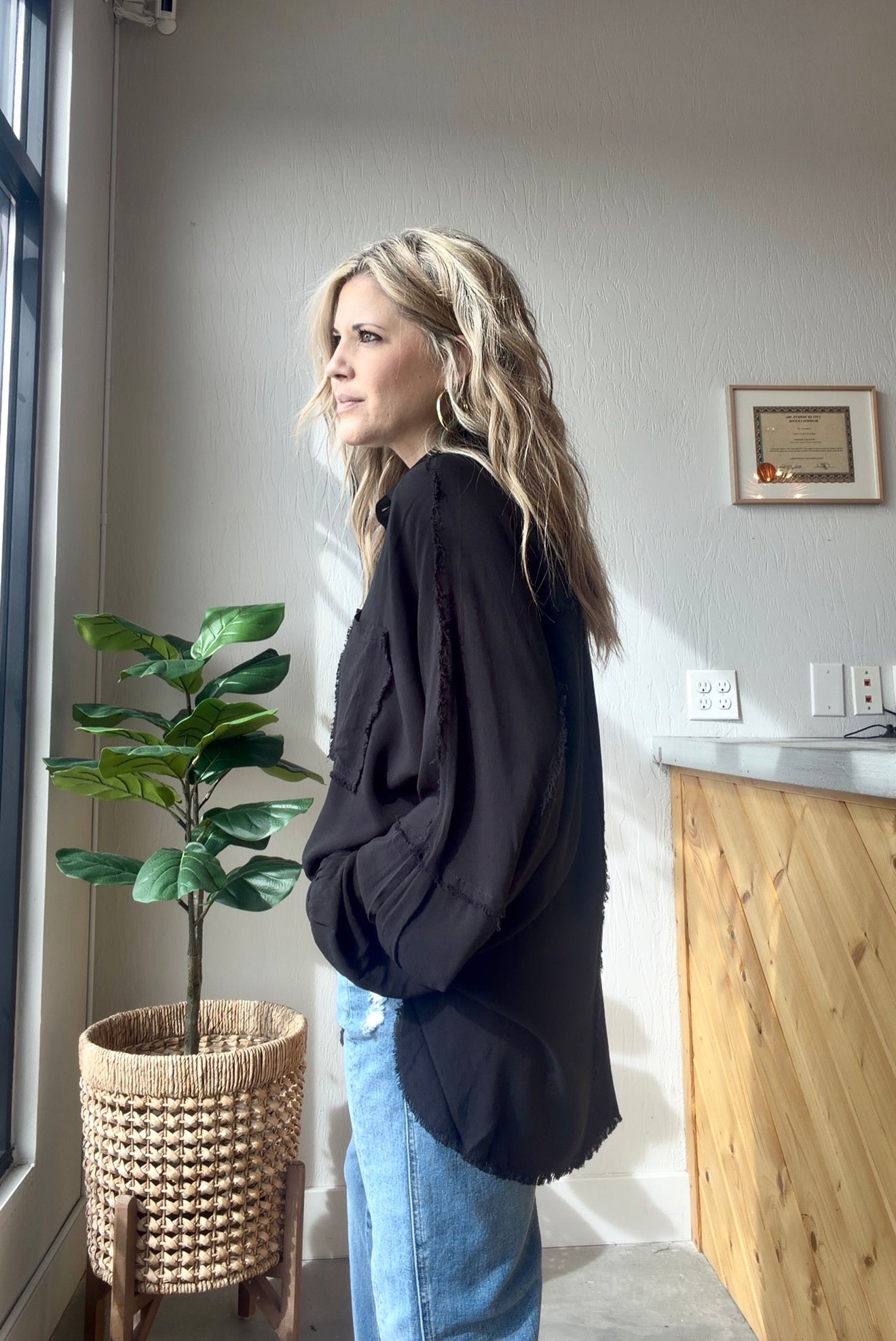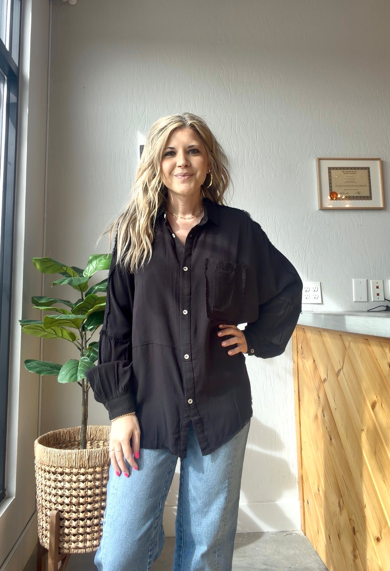 Effortless with just the right amount of edge. This washed black button down features a relaxed, oversized fit with raw hem detailing and a single chest pocket for that perfectly lived-in look.