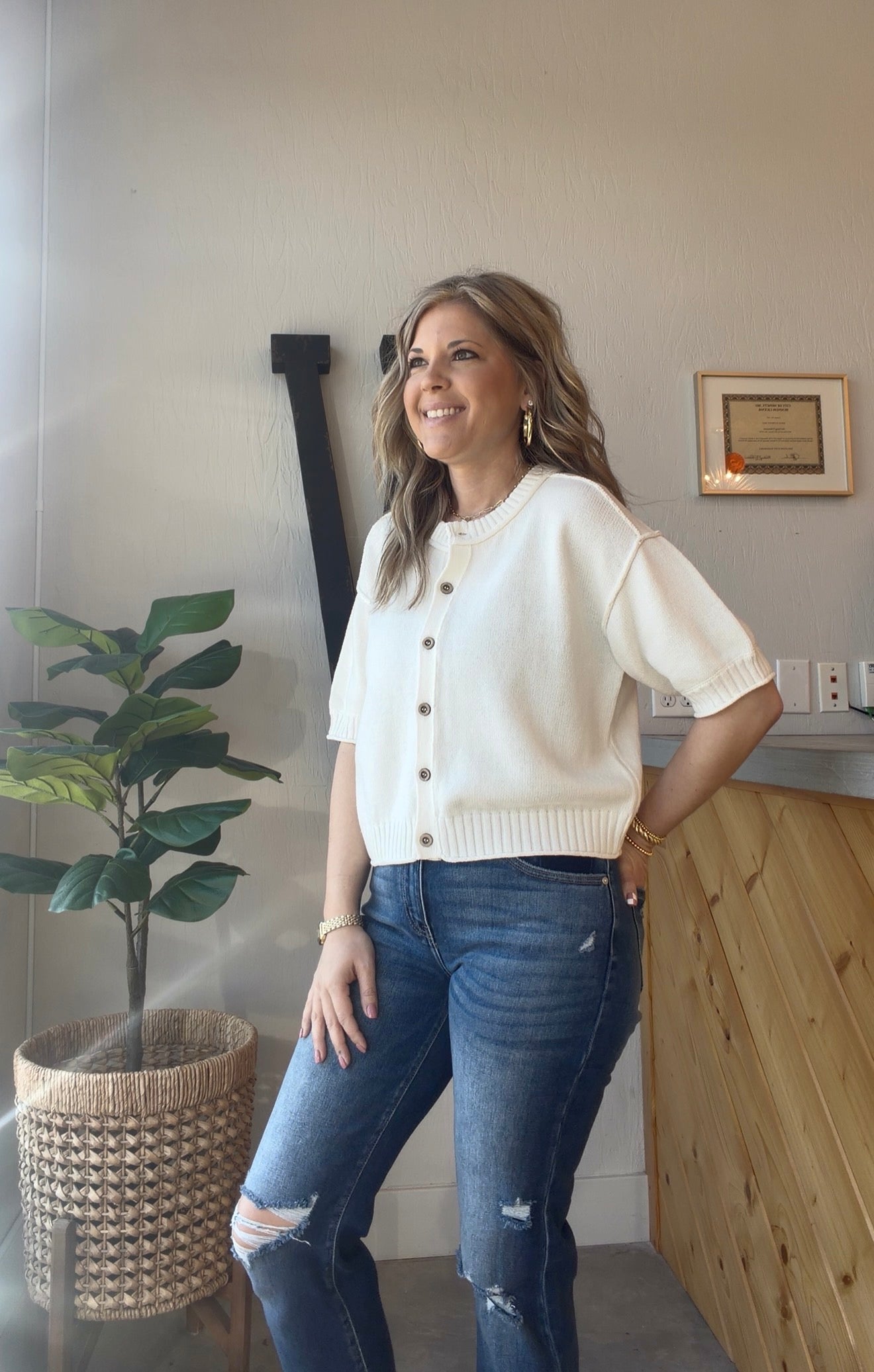 A soft neutral knit with a relaxed fit and classic button-front detail. Finished with ribbed trim and an easy drape, this lightweight sweater pairs effortlessly with denim, trousers, dresses or skirts for an elevated everyday look.